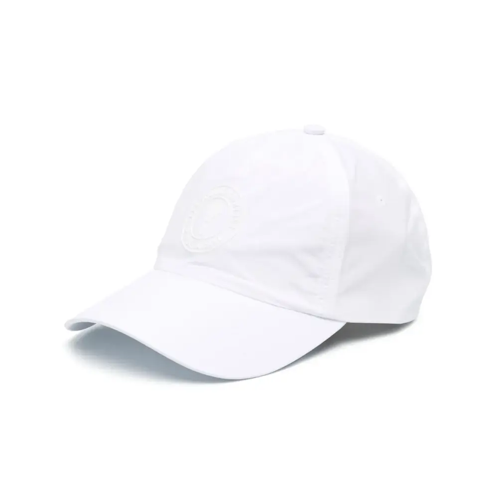 Белый, вышитый логотип спереди, закругленный козырек, пять панелей, обтянутая тканью пуговица на тулье и регулируемый ремешок сзади.