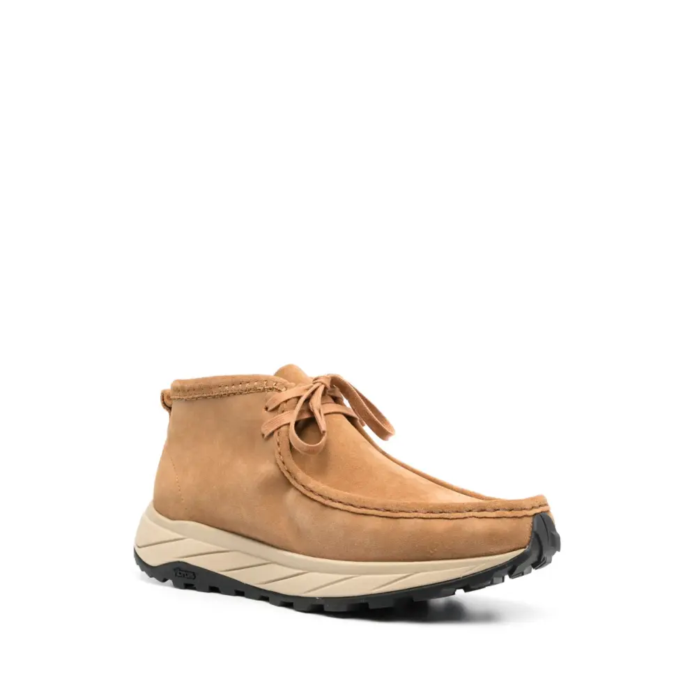 Бежево-коричневый, замша из телячьей кожи, телячья кожа, миндалевидный носок, петля для подтягивания сзади, шнуровка спереди и массивная резиновая подошва.