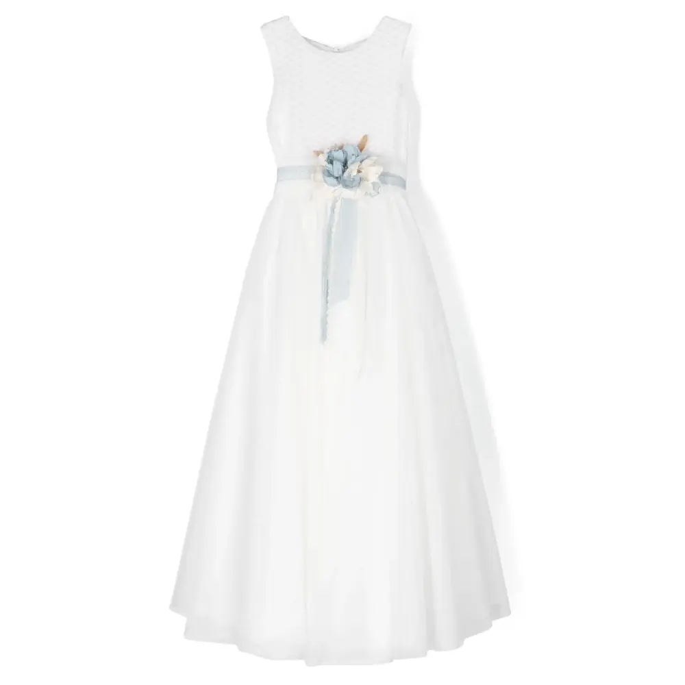 Цветочная аппликация, вставки из кружева, потайная застежка на молнии сзади, кулиска на талии и длинная модель.