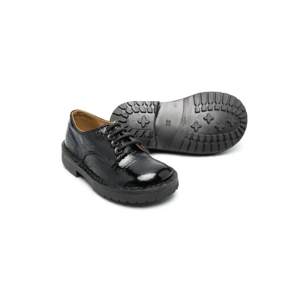 Черный, телячья кожа, лакированная отделка, закругленный носок, шнуровка спереди, стелька с логотипом, кожаная подкладка и резиновая подошва.
