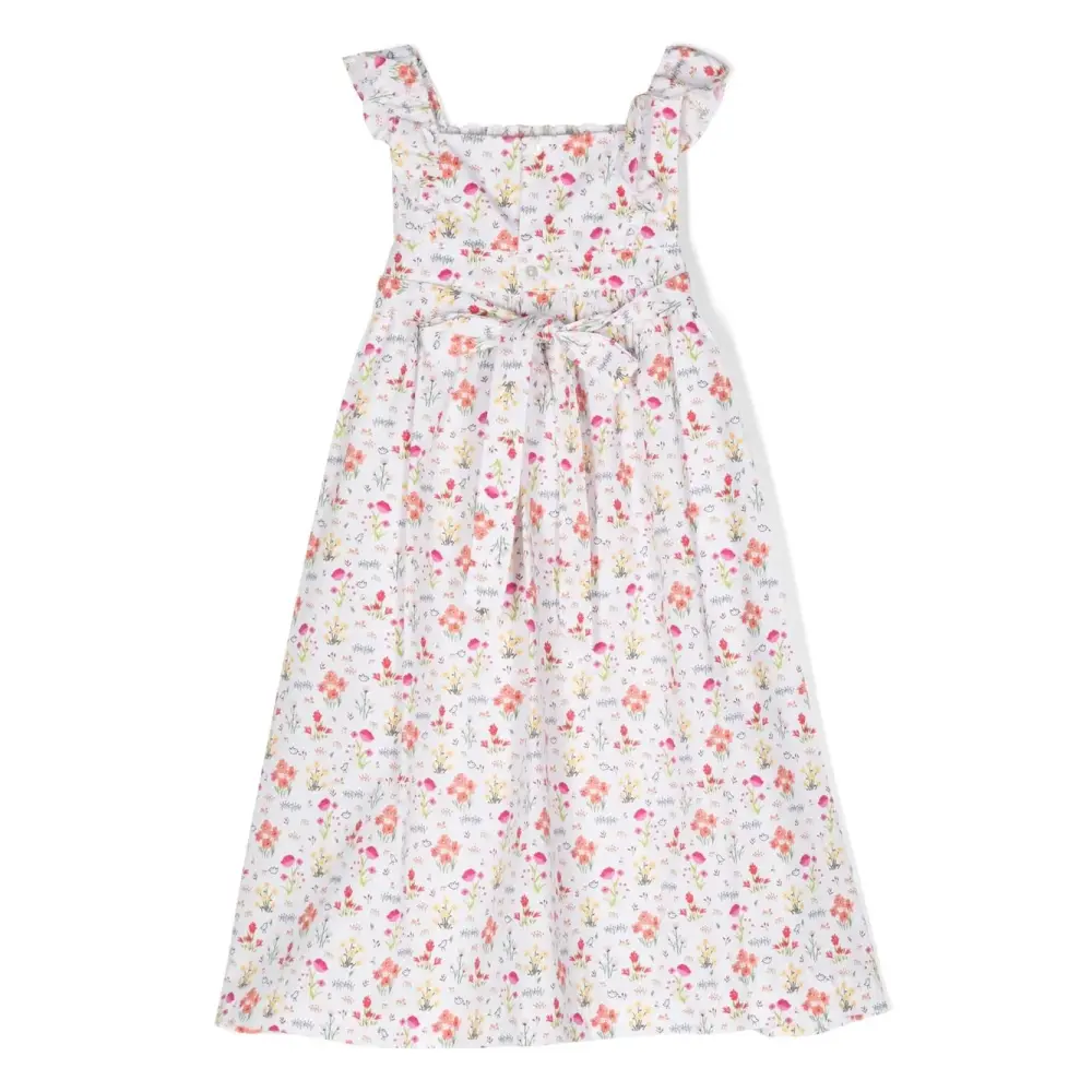 Белый/разноцветный, хлопок, сплошной графичный принт, сплошной цветочный принт, вставки с оборками, складки, квадратный вырез, застежка на пуговицы сзади, застежка на завязке сзади, без рукавов и расклешенный крой.