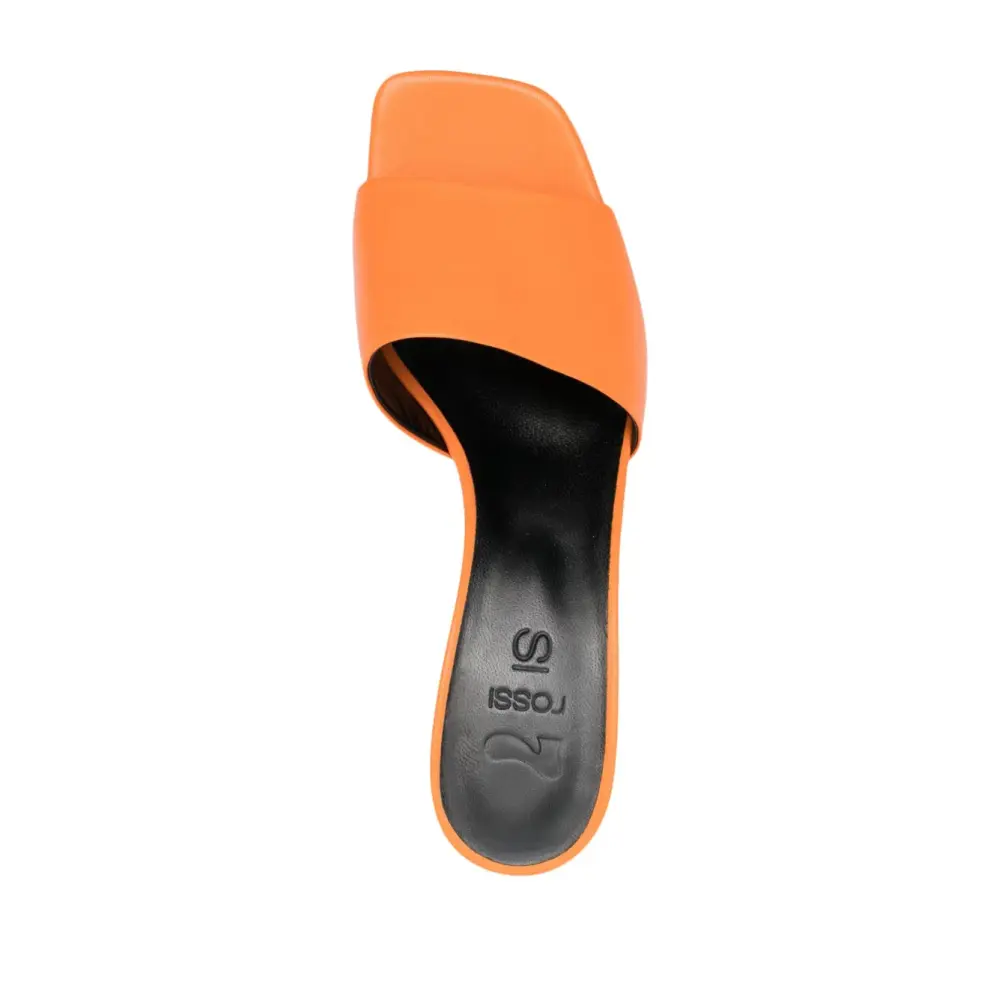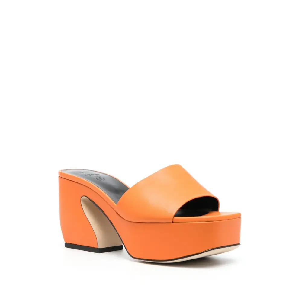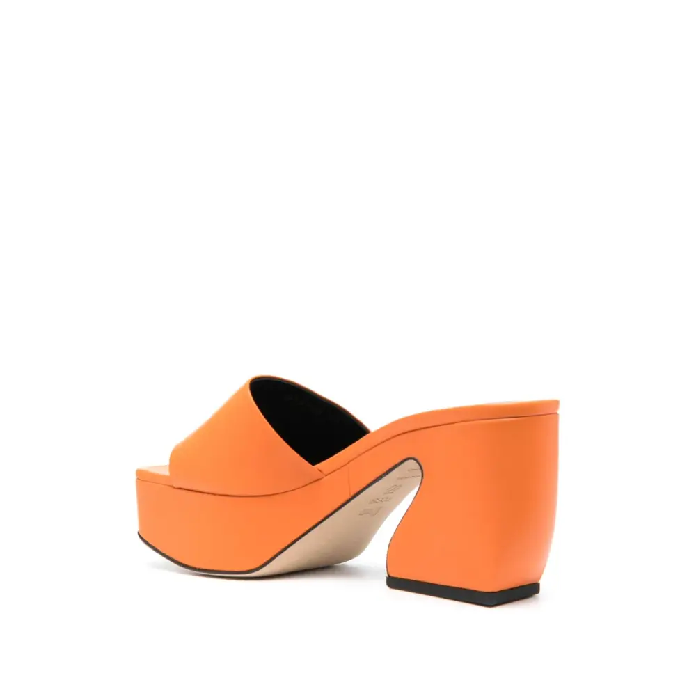 Оранжевый, телячья кожа, открытый носок, кожаная стелька с логотипом, высокий скульптурный каблук и кожаная подошва.