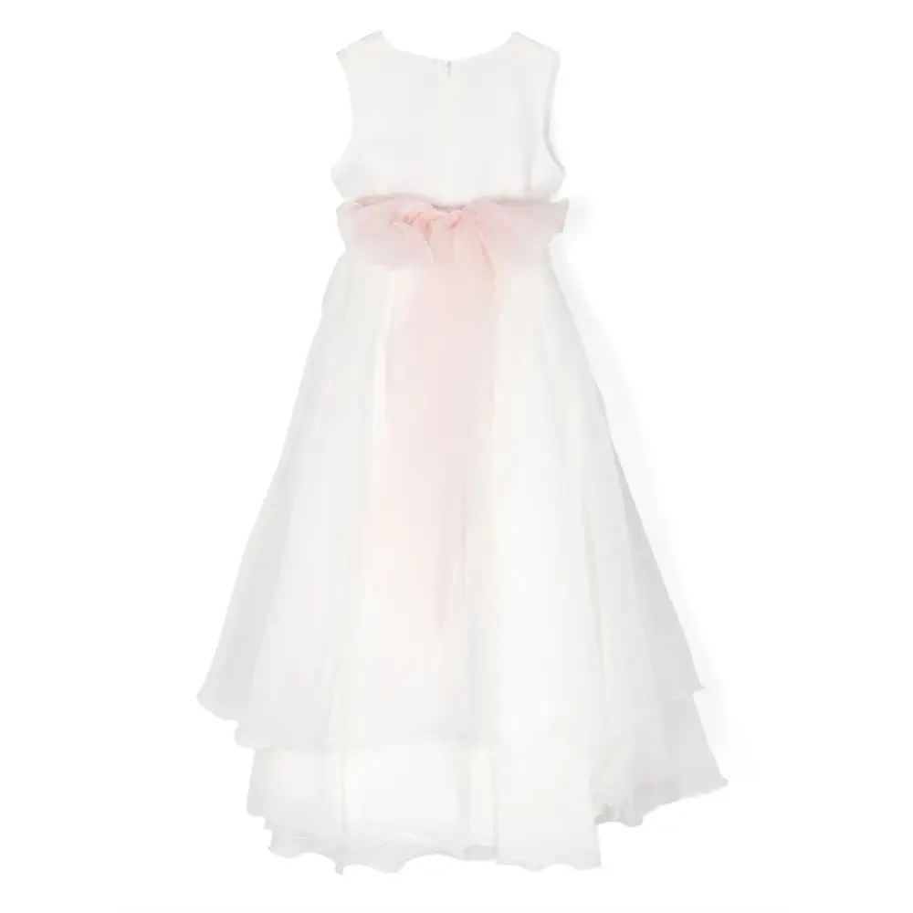 Белый, смесовый хлопок, цветочная аппликация, ампирный силуэт, плиссированная юбка, верхний слой из тюля, круглый вырез, застежка на завязке сзади, потайная застежка на молнии сзади, без рукавов, длинная модель и подол с оборками.