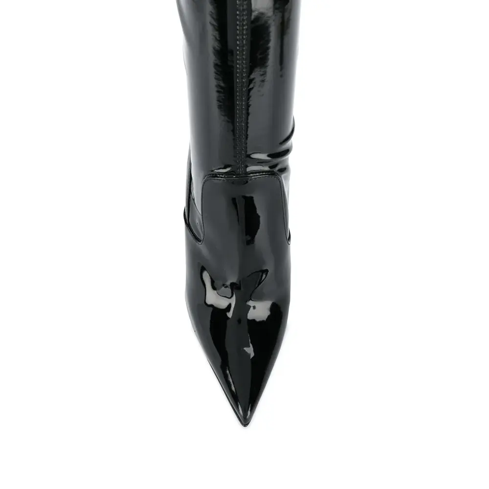 Глянцевая фактура, заостренный носок, без застежки и высокий каблук. Цвет: черный.