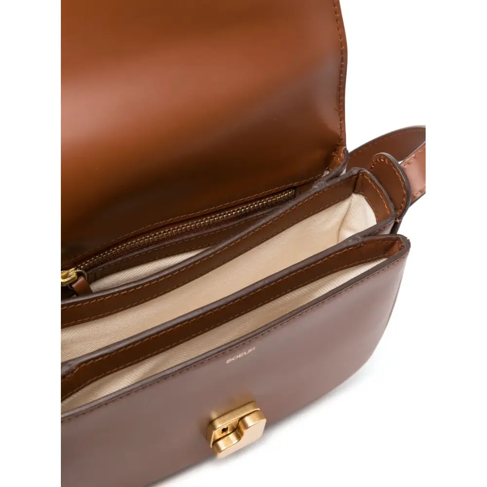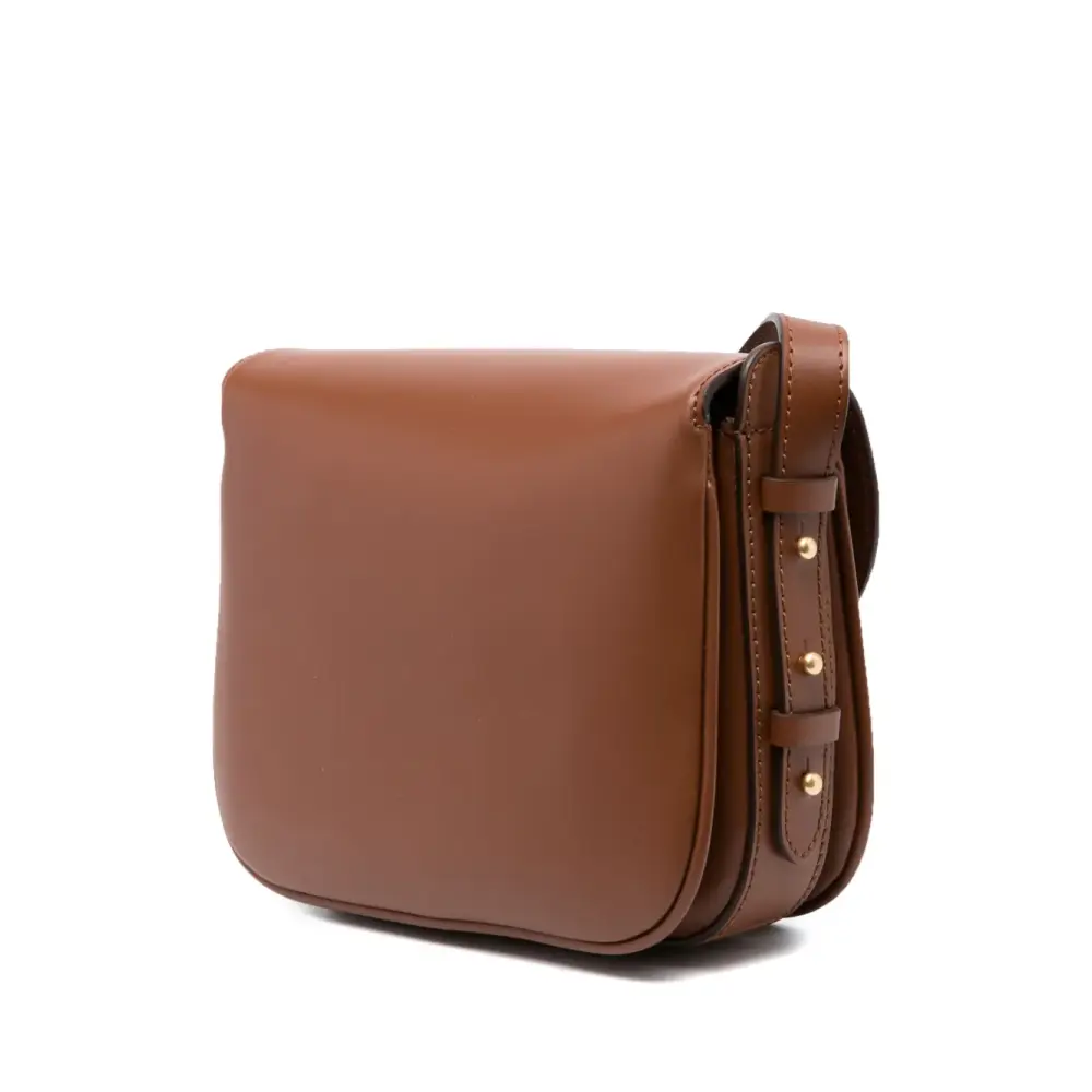 Карамельный, телячья кожа, тисненый логотип спереди, откидной клапан на магните, золотистая фурнитура, регулируемый ремень на плечо, несколько отделений и внутренний карман на молнии.