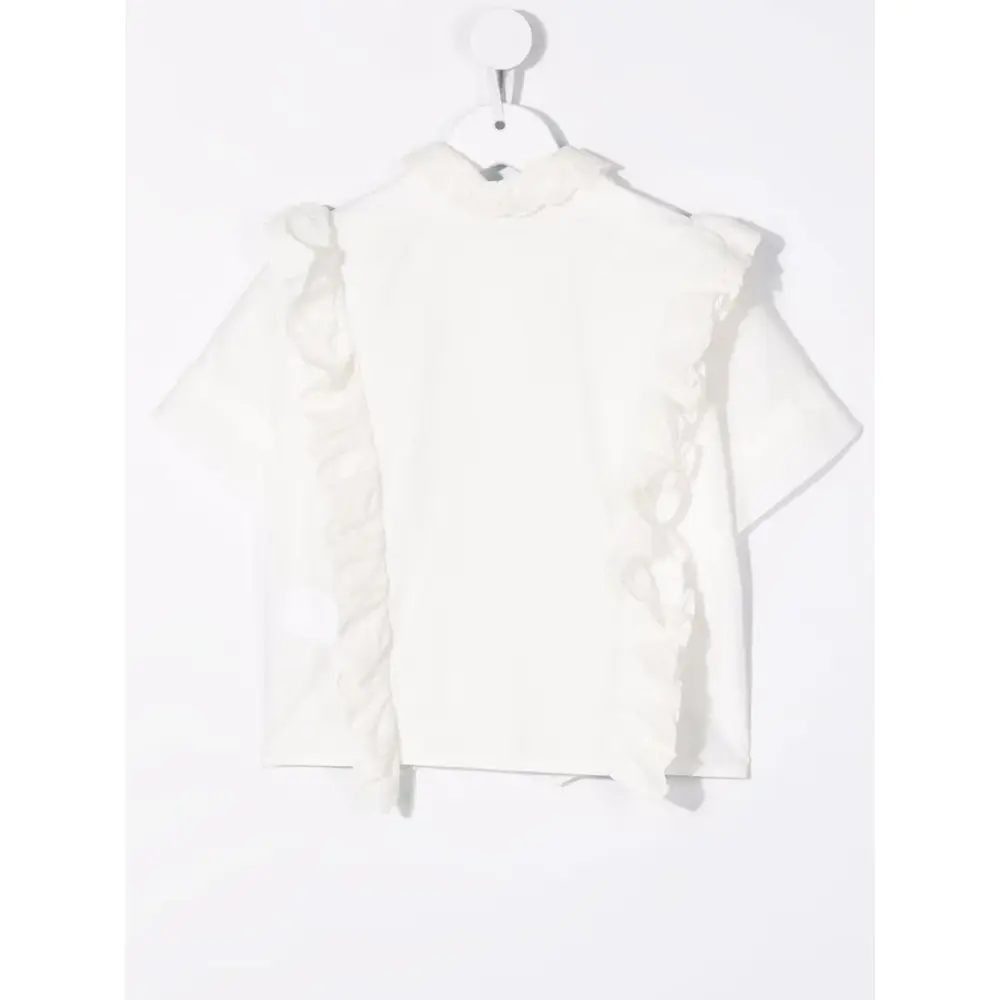Вставки с оборками, планка на пуговицах спереди, классический воротник, короткие рукава и прямой подол. Цвет: белый.