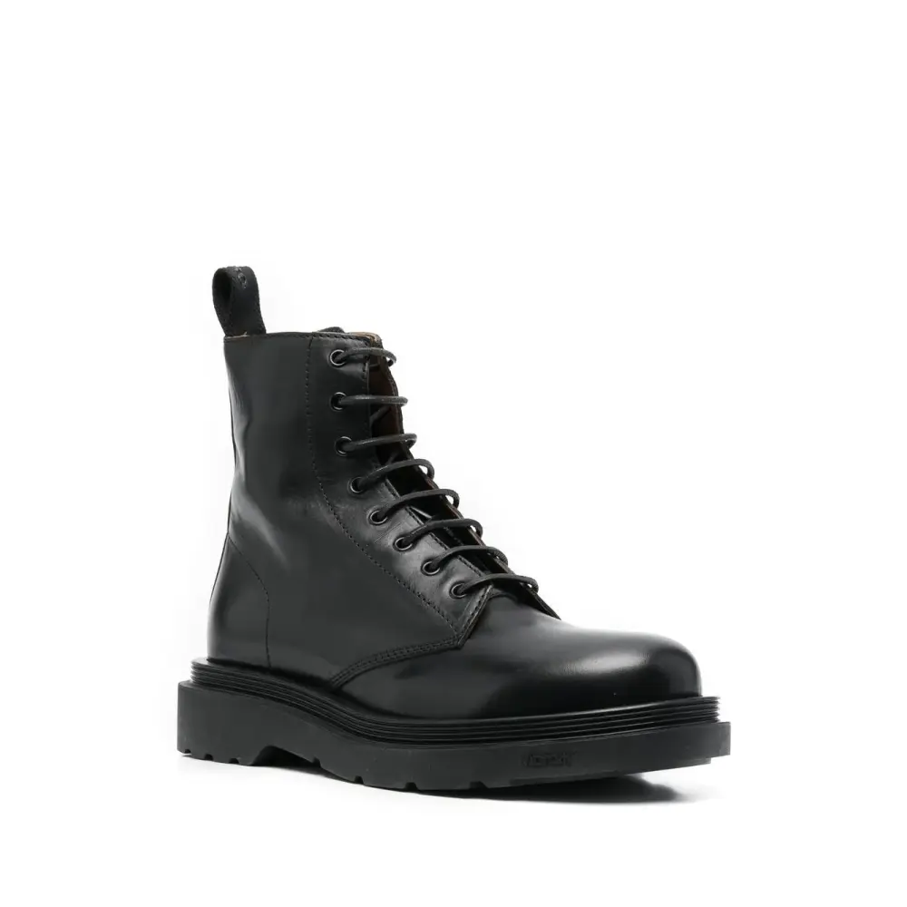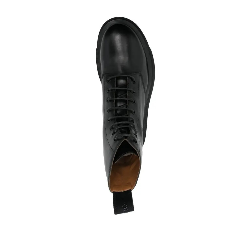 Черный, кожа, люверсы, шнуровка спереди, закругленный носок и массивная резиновая подошва.