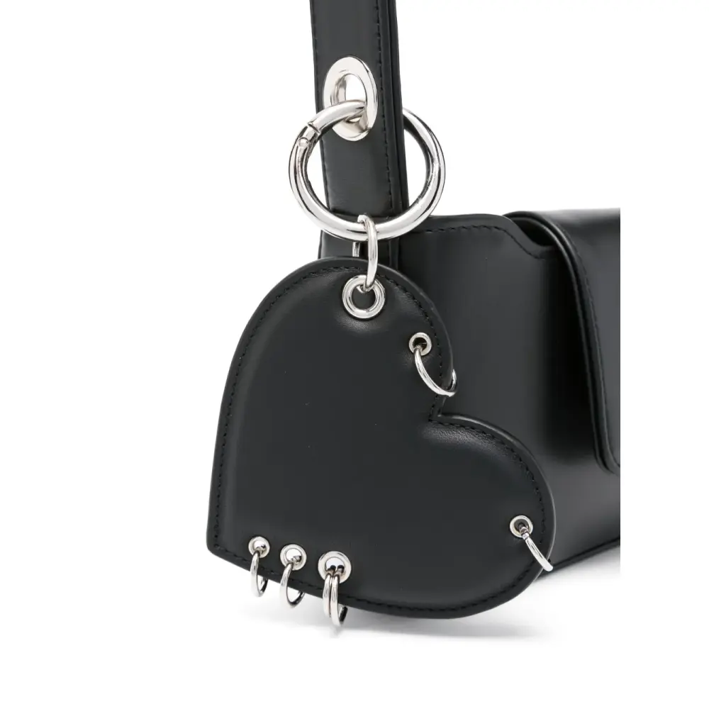Черный, телячья кожа, гладкая текстура кожи, подвеска в форме сердца, декор в виде кольца, ручка с плоским верхом, застежка на ремешке и магните, основное отделение, внутренние накладные карманы и серебристая фурнитура.