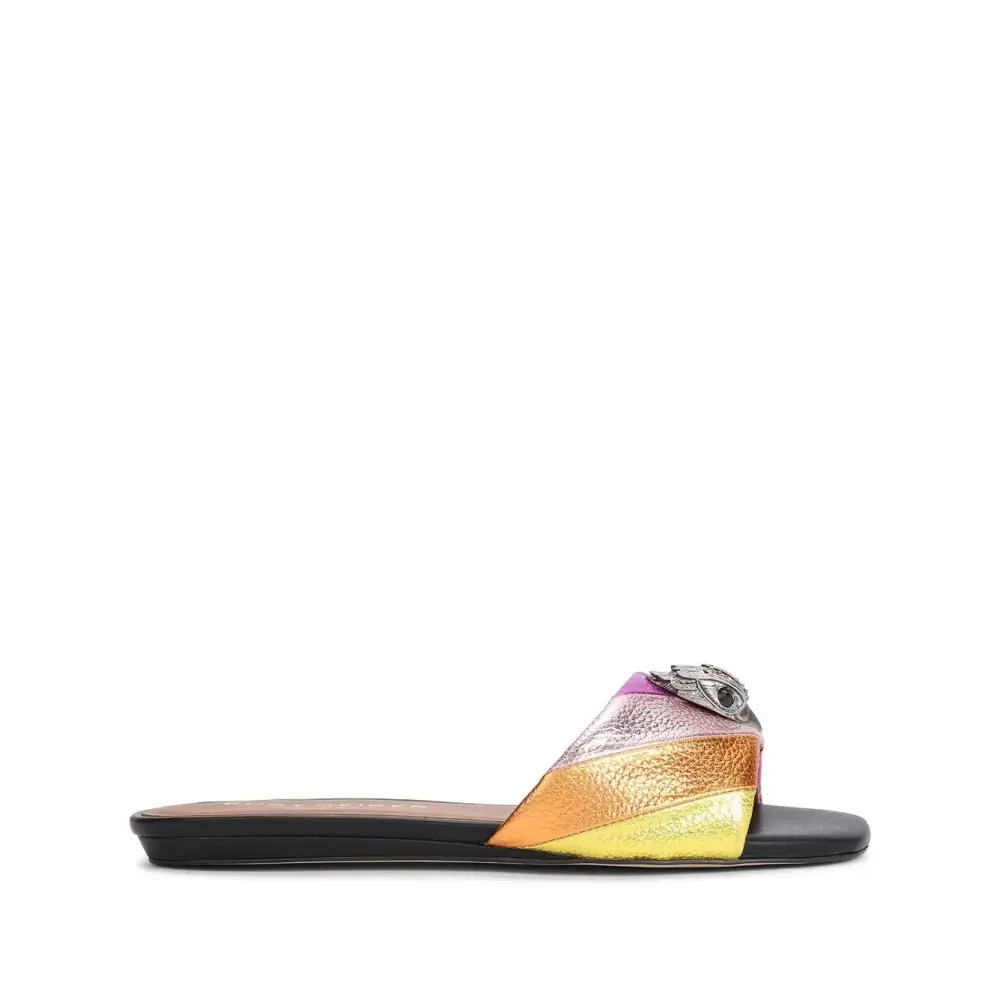 Разноцветный, телячья кожа, зернистая текстура, стеганая модель, аппликация, открытый носок, квадратный носок, открытая спина, ремешок на палец, логотип на стельке, плоская подошва и модель без застежки.