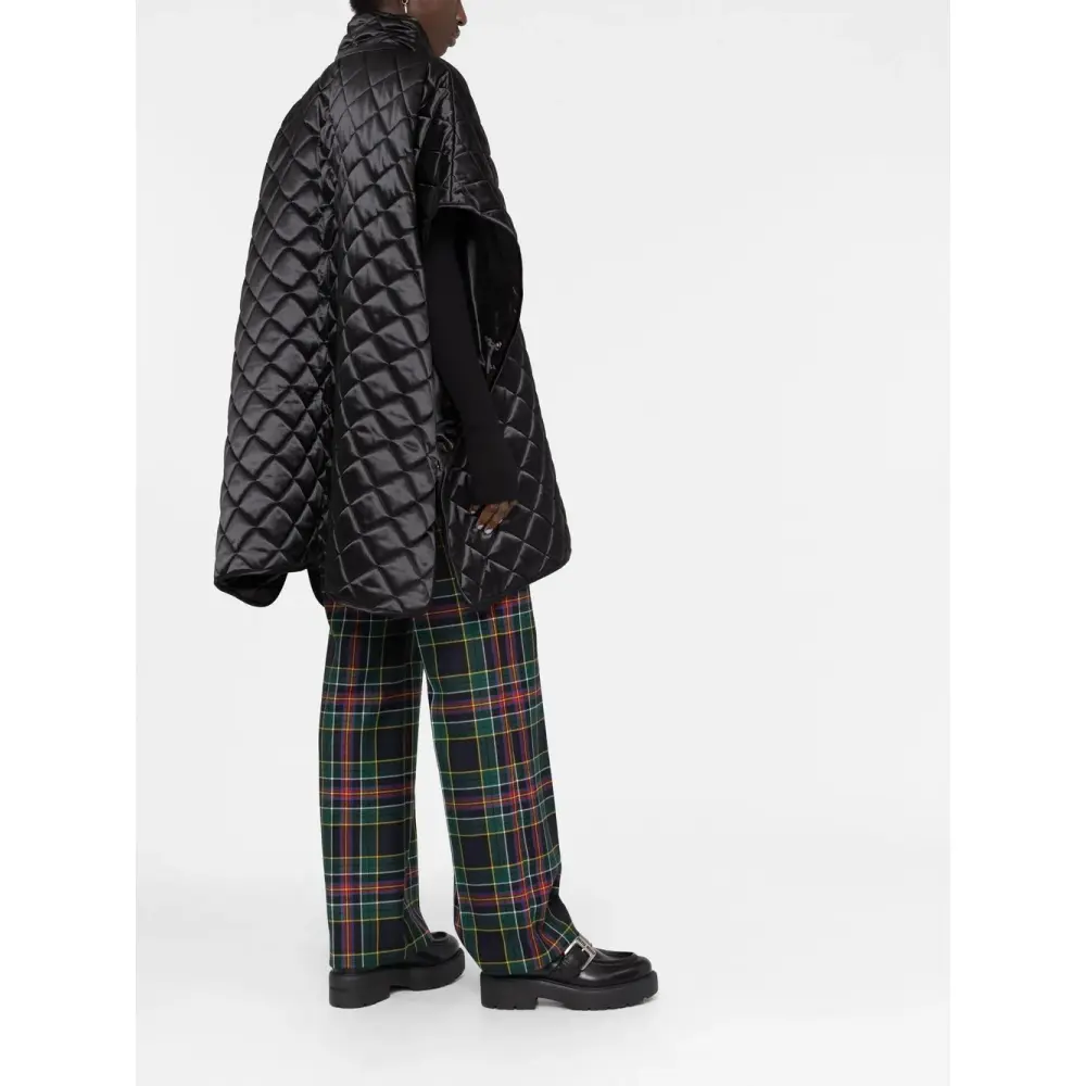 Черный, стеганый узор в ромб, застежка на пуговицах спереди, высокий воротник и короткие рукава.