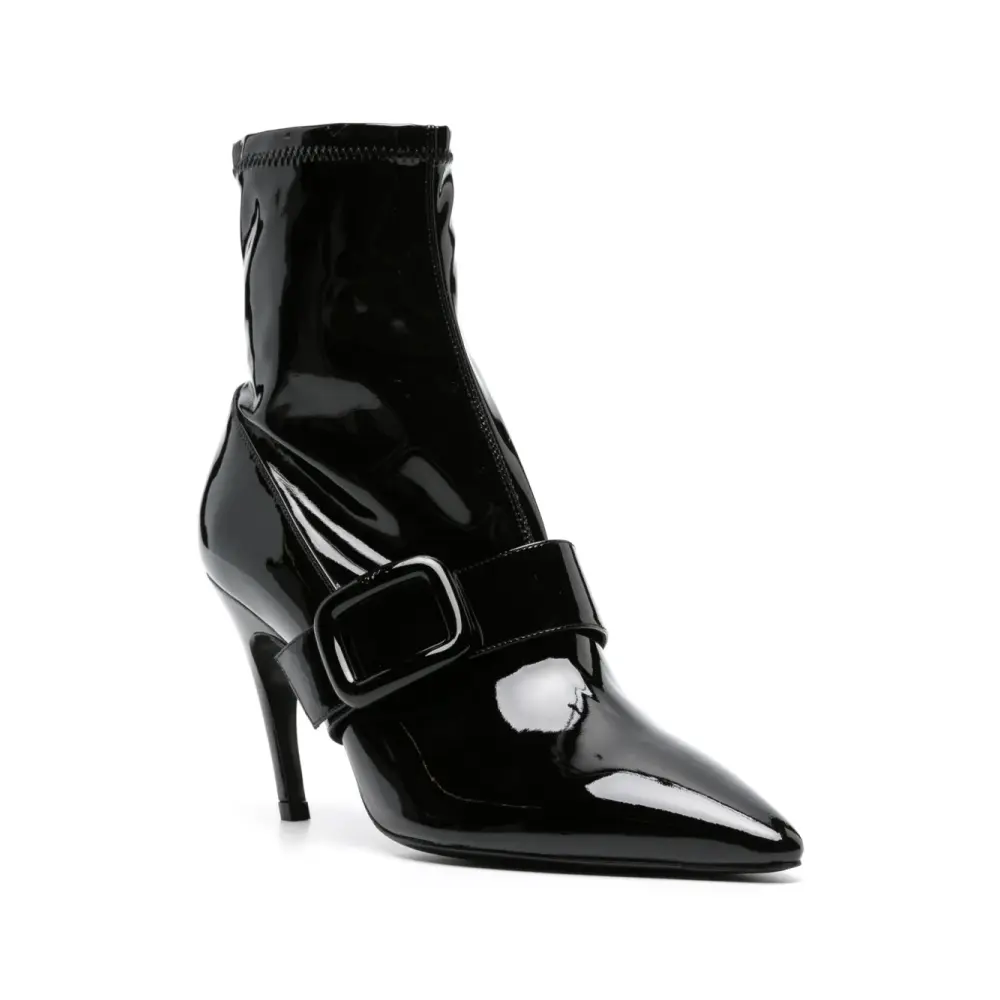 Черный, телячья кожа, лакированная отделка, декоративная пряжка, строчка в тон, заостренный носок, высота по щиколотку, застежка на молнии сбоку, стелька с логотипом, высокий каблук конической формы и кожаная подошва.