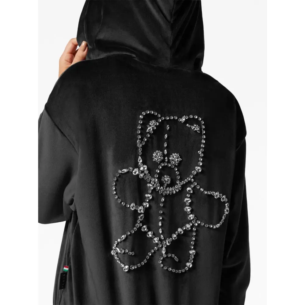 Черный, модель из двух частей, нашивка с логотипом на груди, декор из кристаллов, классический капюшон, длинные рукава, застежка на молнии спереди, кулиска на талии и облегающий крой.