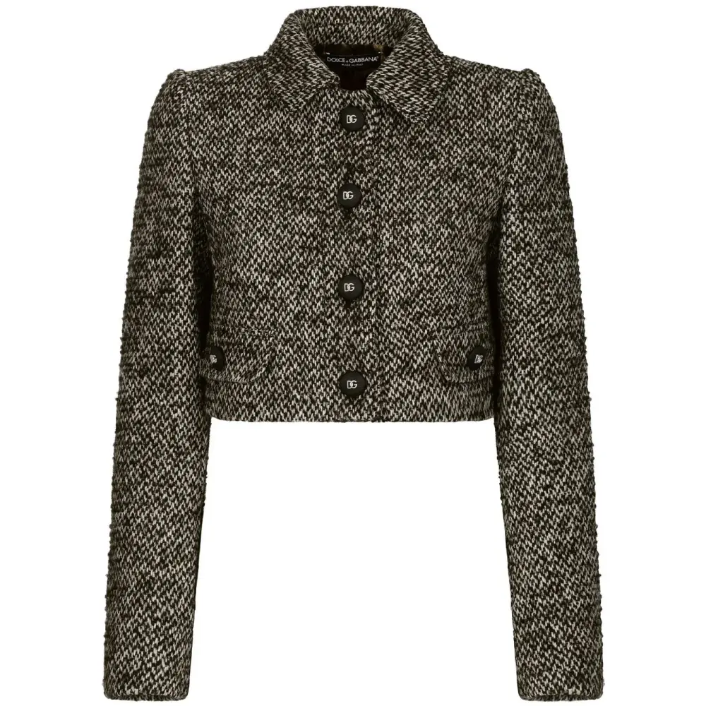 Коричневый, смесовая шерсть, твидовая ткань, классический воротник, золотистые пуговицы с тиснением, застежка на пуговицах спереди, длинные рукава, укороченная длина и прямой подол.