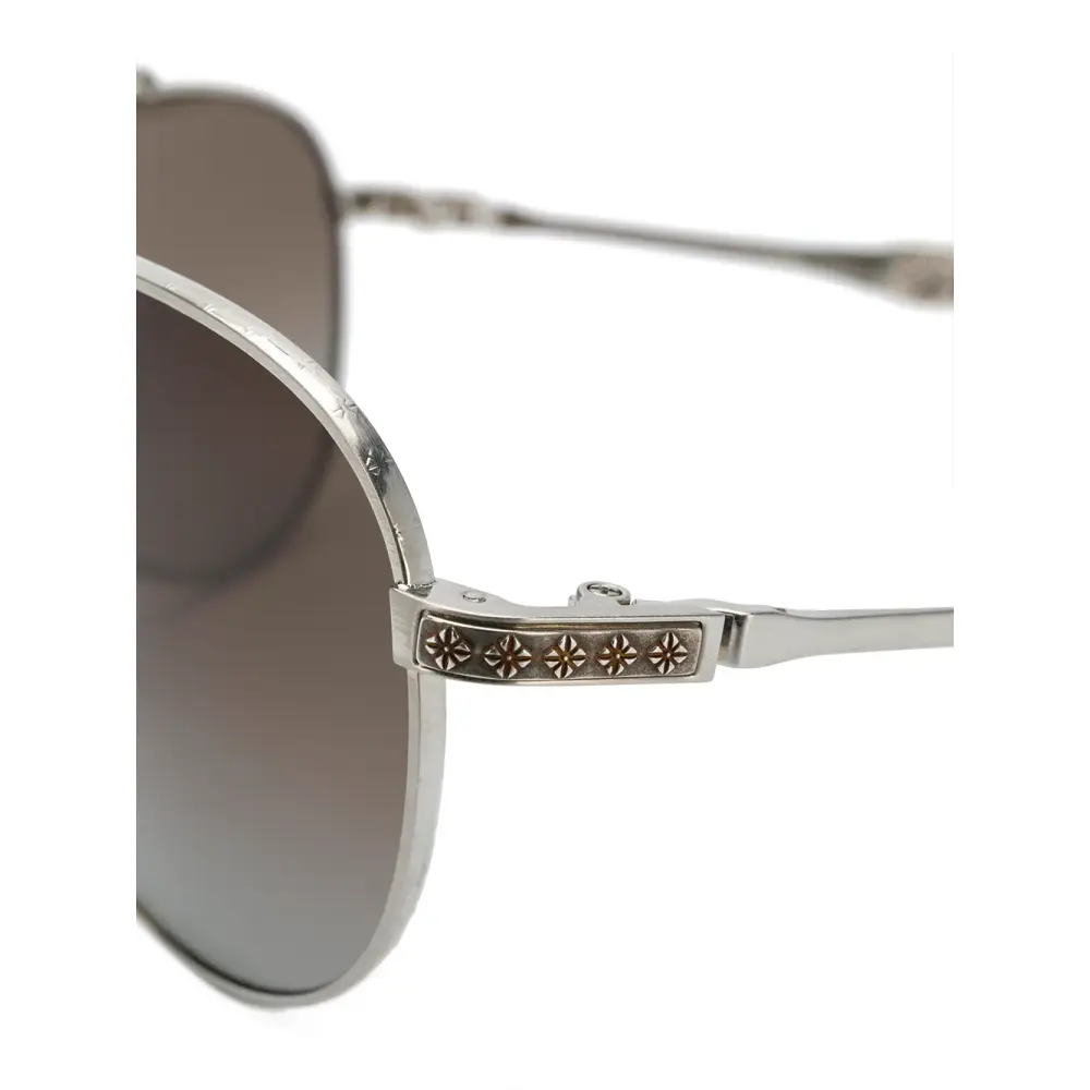 Металлические солнцезащитные очки Shamballa X Larry Sands Evermore от SHAMBALLA EYEWEAR. Свободный крой, градиентные линзы, прямые дужки с изогнутыми концами, золотистый логотип, 100% защита от ультрафиолета.
