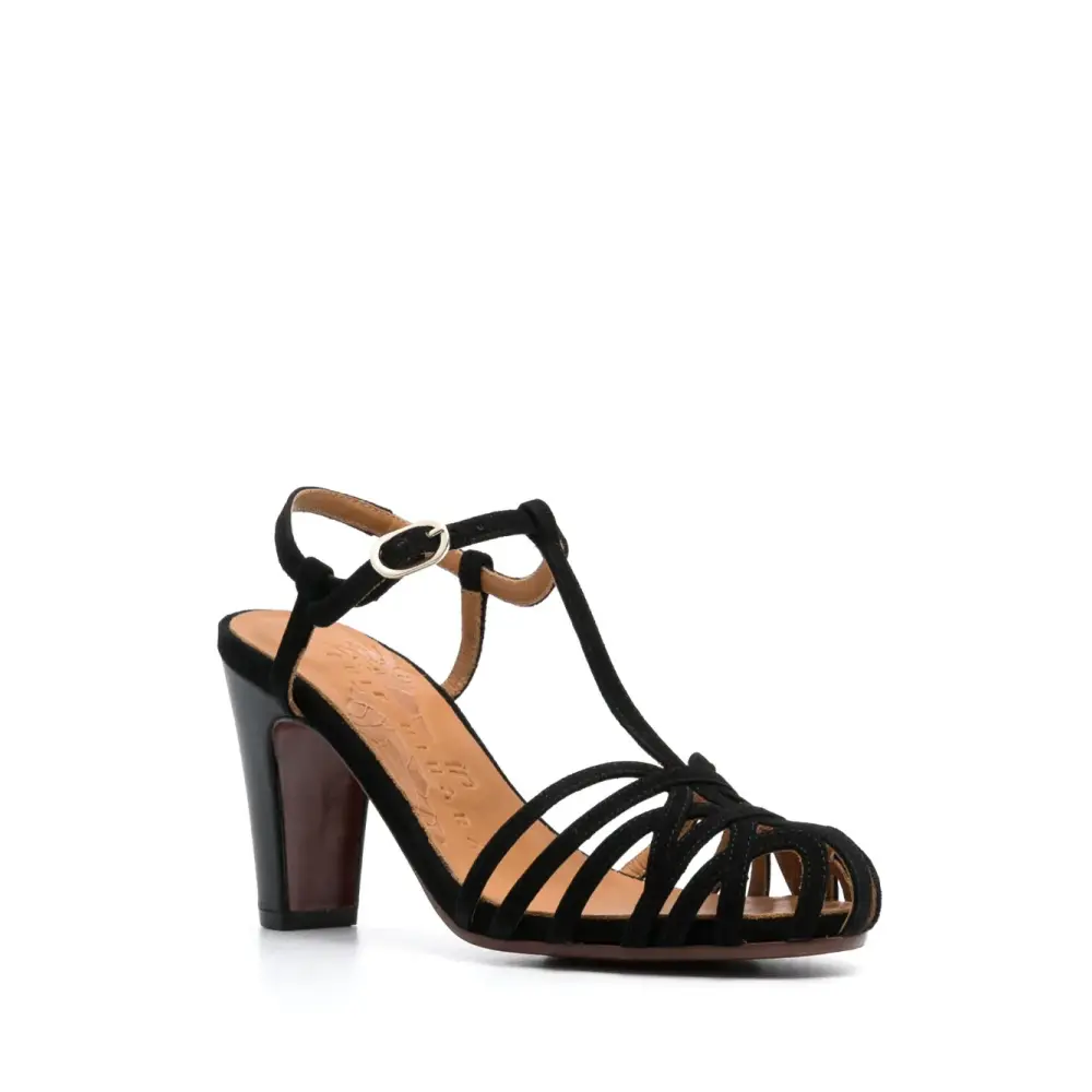 Черный, телячья кожа, конструкция с внешним каркасом, тисненый логотип внутри и ремешок на щиколотке с пряжкой.