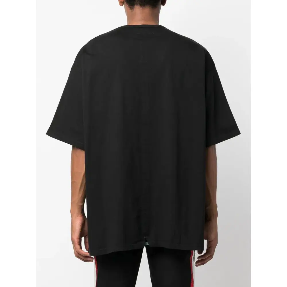 Черный, хлопок, нашивка с логотипом спереди, круглый вырез, короткие рукава и прямой подол.