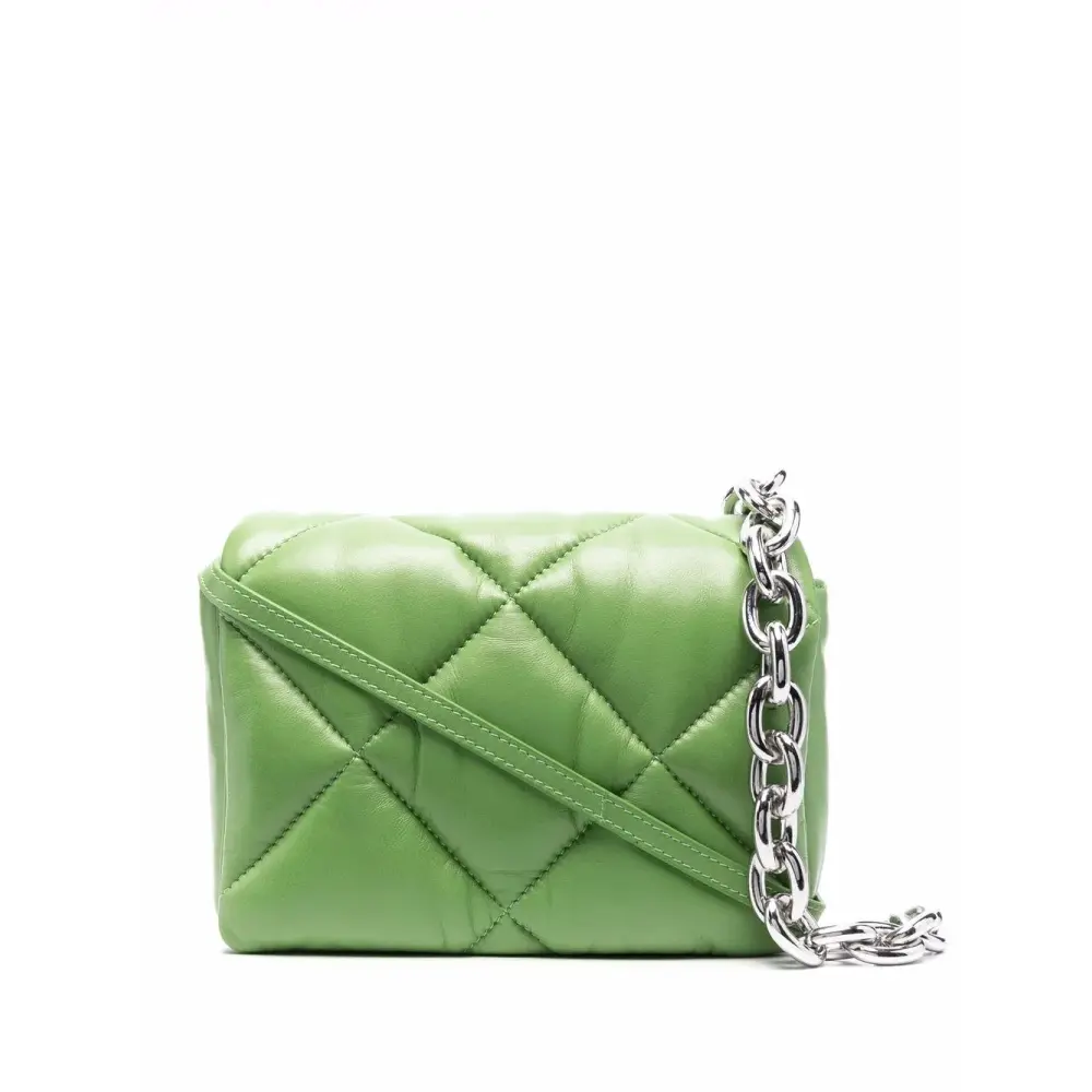 Стеганая отделка, застежка с клапаном спереди, потайная застежка на магните, ремешок-цепочка на плечо и основное отделение.