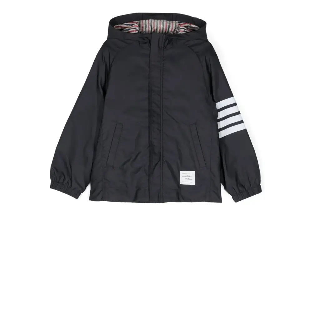 Темно-синий, дутый материал, полоски 4-Bar, классический капюшон, застежка на молнии спереди, длинные рукава и прорезные карманы по бокам.