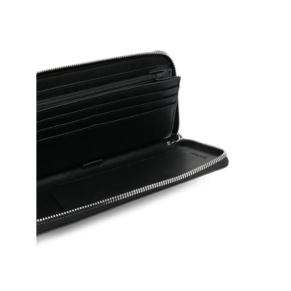 Серебристый металлический логотип, круговая молния, внутренние отделения для карт и внутренний карман на молнии.