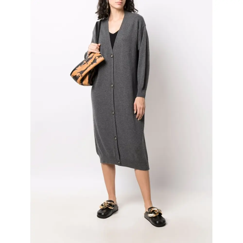 Вязаные края в рубчик, V-образный вырез, застежка на пуговицах спереди, приспущенные плечи, длинные рукава, прямой подол и длина миди.