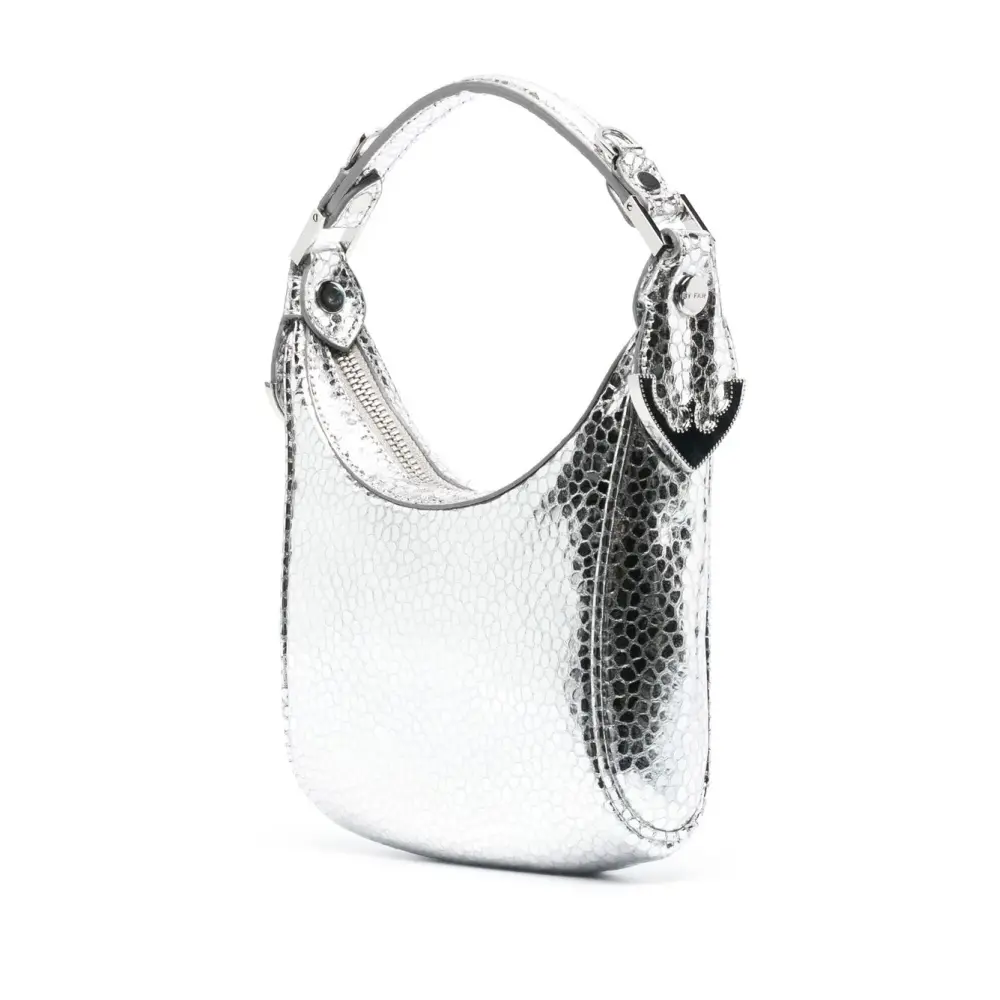 Серебристый, козья кожа, эффект металлик, фактурная отделка, серебристая фурнитура, ручка с плоским верхом, застежка на молнии сверху, съемный регулируемый ремень на плечо, нашивка с логотипом внутри и подкладка из хлопка.