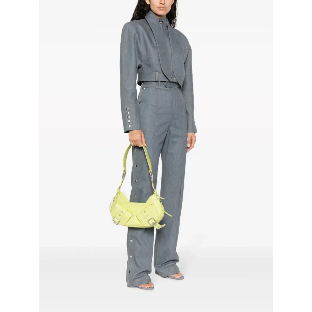 Неоново-зеленый, хлопок/кожа, нашивка с логотипом внутри, серебристая фурнитура, перфорация, застежка на молнии сверху, застежка на пряжке, регулируемый ремень на плечо, два передних кармана с клапанами и основное отделение.