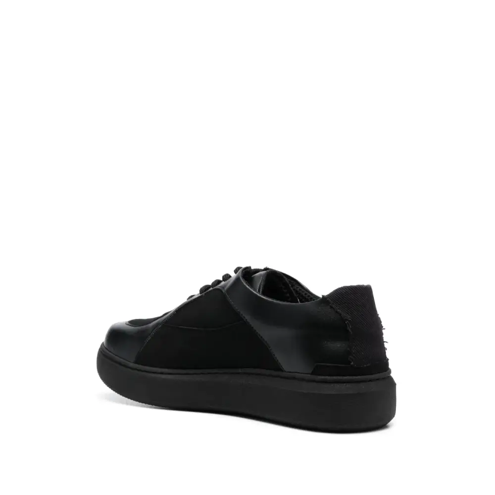 Черный, искусственная замша, вставки, нашивка с логотипом сбоку, закругленный носок, шнуровка спереди, стелька с логотипом и плоская резиновая подошва.