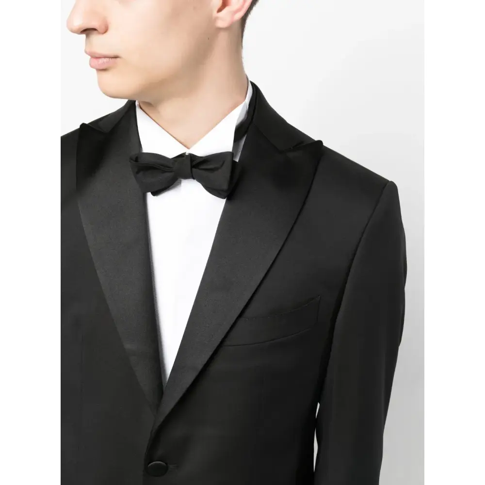 Черный, шерсть, сатиновая фактура, заостренные лацканы, обтянутые тканью пуговицы, застежка на пуговицах спереди, два передних кармана с листочкой, прорезной карман на груди, длинные рукава, рукава с манжетами на пуговицах, без шлиц, прямой подол, петли для ремня, стрелки, строгий крой и потайная застежка на молнии и пуговицах.
