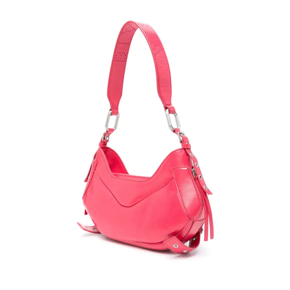 Фуксия, телячья кожа, нашивка с логотипом внутри, серебристая фурнитура, перфорация, застежка на молнии сверху, застежка на пряжке, регулируемый ремень на плечо, два передних кармана с клапанами и основное отделение.