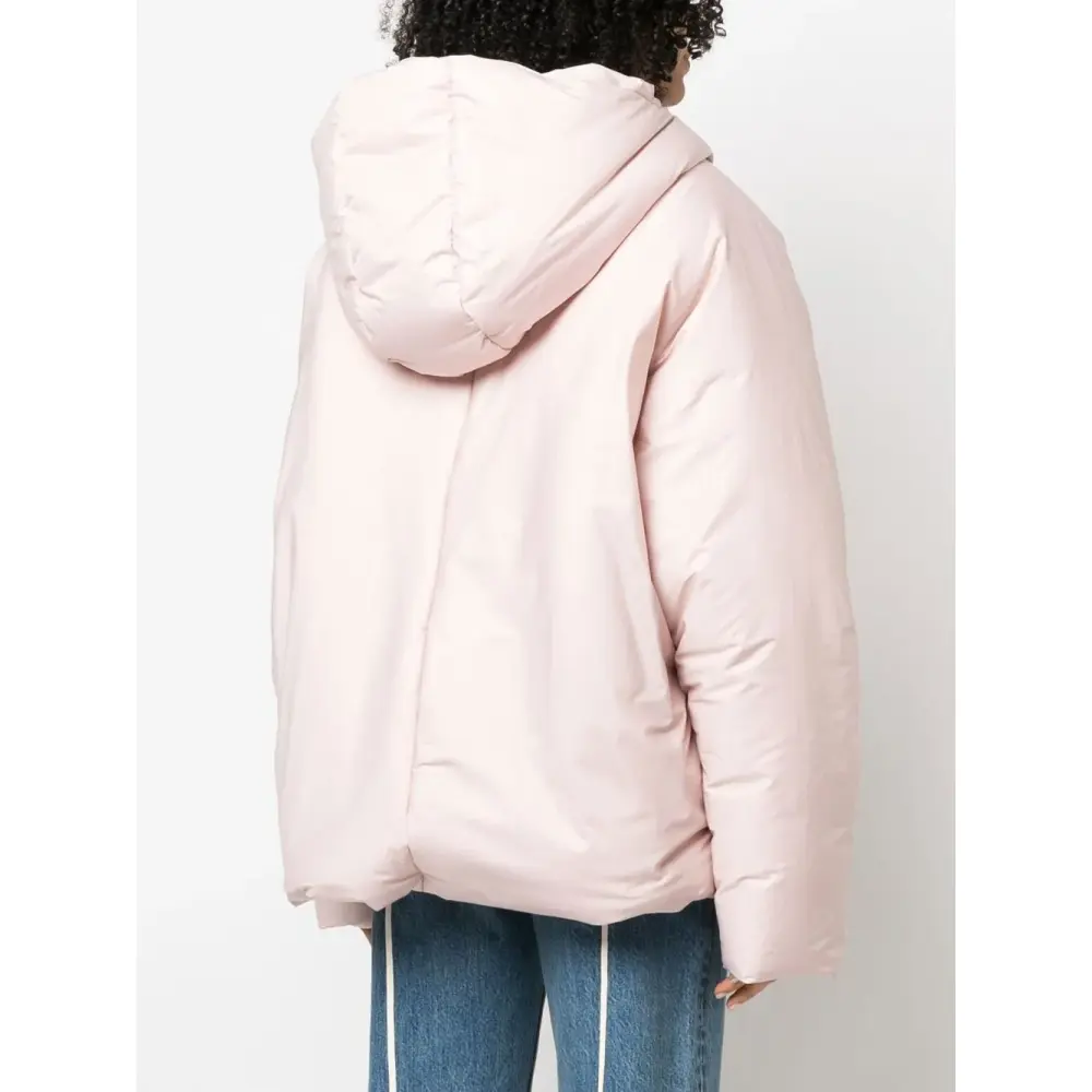 Пудрово-розовый, дутый материал, круглый вырез, длинные рукава и застежка на молнии спереди.