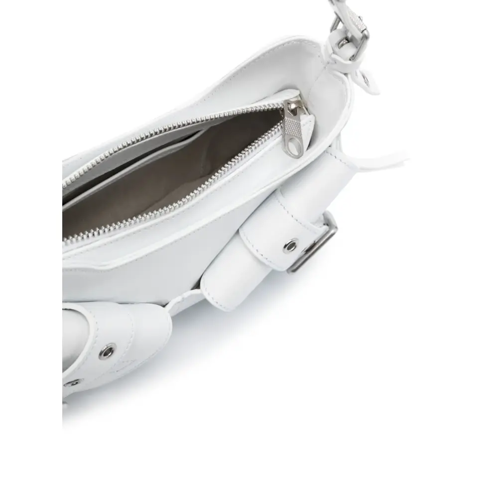 Белый, хлопок/кожа, нашивка с логотипом внутри, серебристая фурнитура, перфорация, застежка на молнии сверху, застежка на пряжке, регулируемый ремень на плечо, два передних кармана с клапанами и основное отделение.