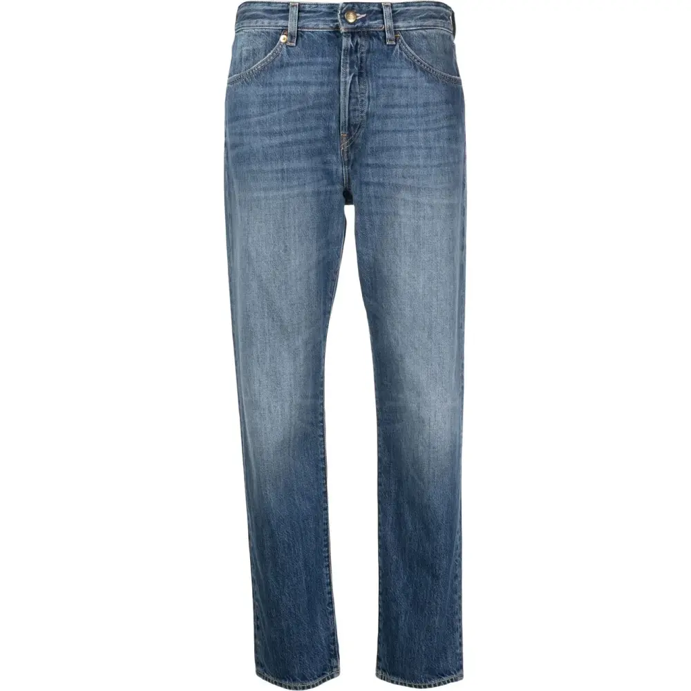 Синий, органический хлопок, обработанный деним, декоративная строчка, нашивка с логотипом сзади, пуговицы с выгравированным логотипом, средняя посадка, потайная застежка на молнии и пуговицах, прямой крой и петли для ремня. Ответственный выбор: