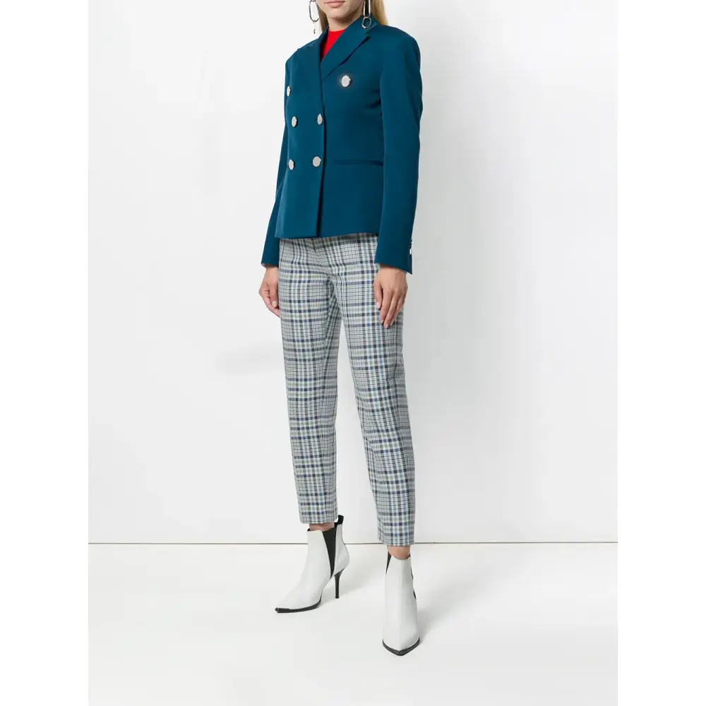 Синий шерстяной двубортный пиджак от CALVIN KLEIN 205W39NYC. Заостренные лацканы, длинные рукава, двубортный фасон.