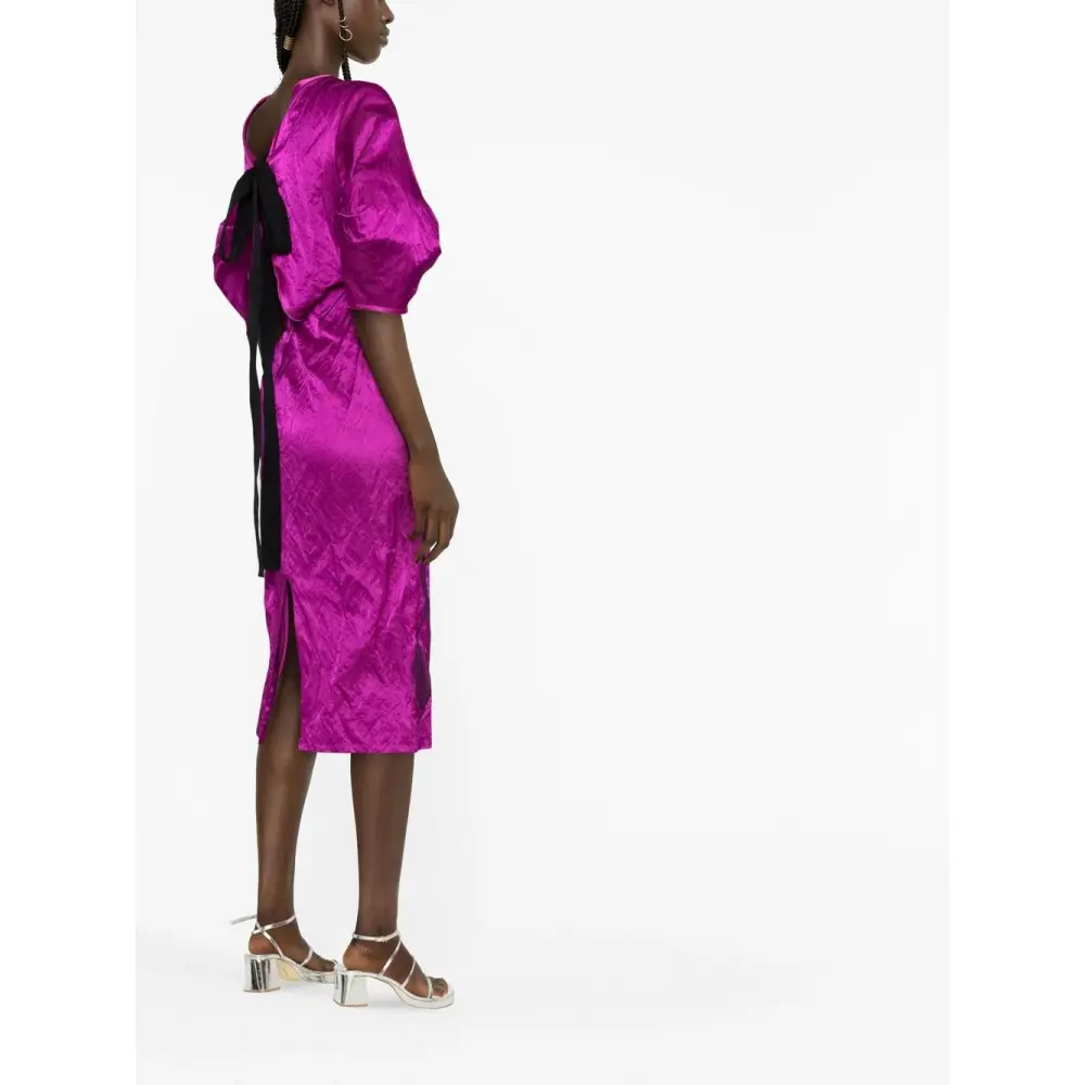 Аметистовый, люрекс, круглый вырез, короткие объемные рукава, вырез сзади и длина миди.