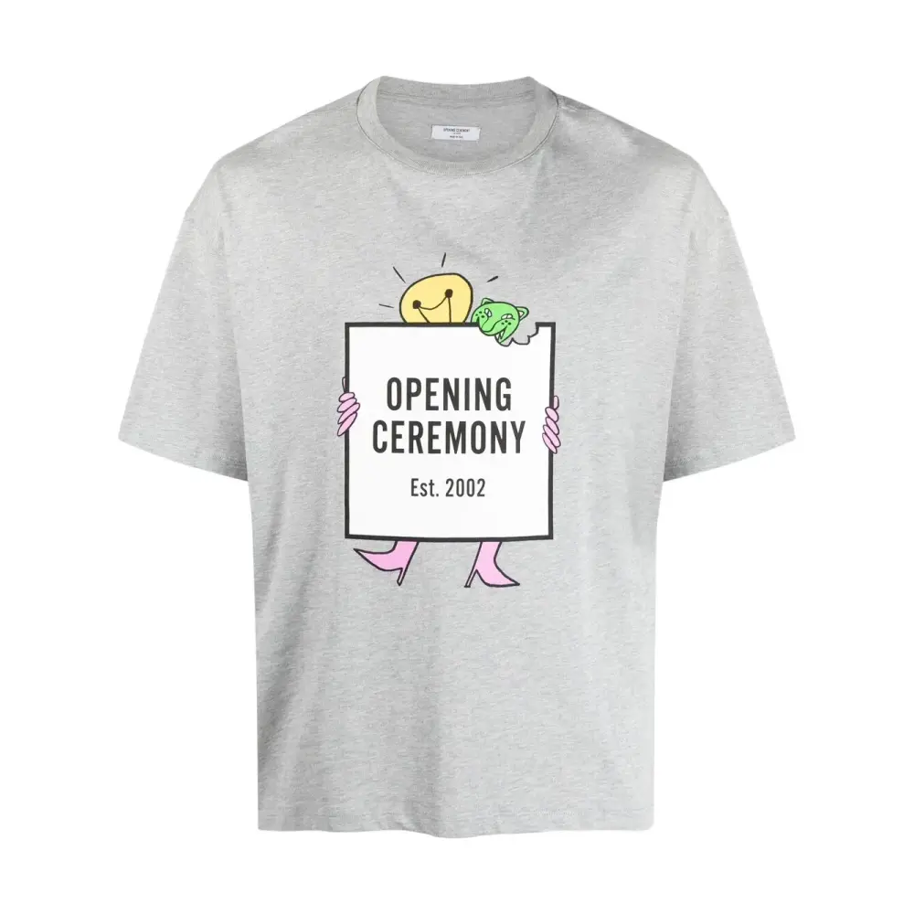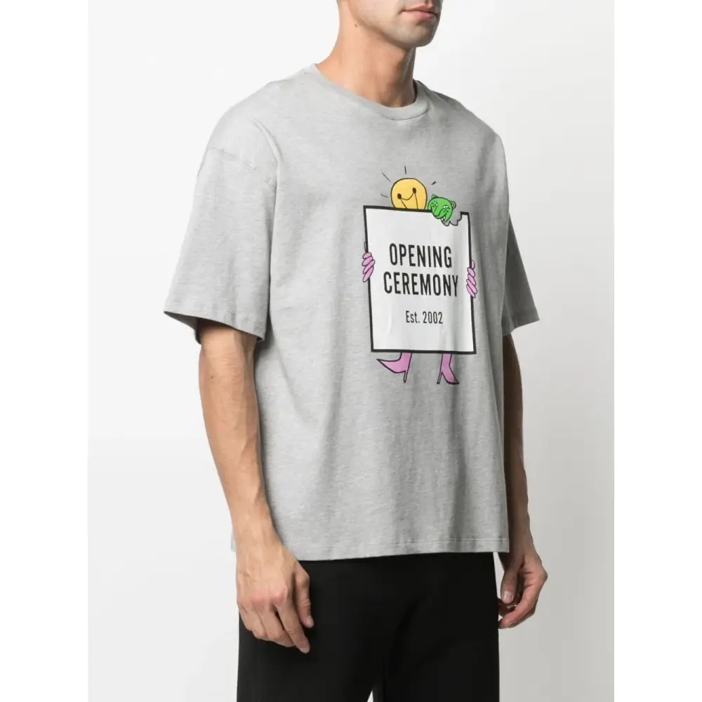 Круглый вырез, приспущенные плечи, короткие рукава, прямой подол, графичный принт на спине, принт на груди и логотип спереди. Цвет: серый.