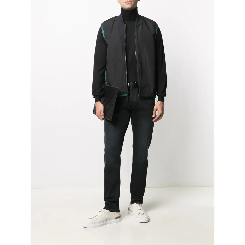 Высокий воротник, длинные рукава и подол в рубчик. Цвет: черный.