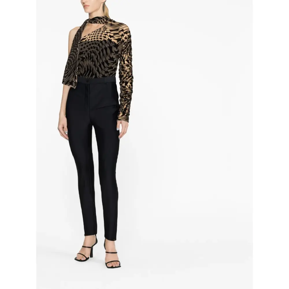 Черный, завышенная талия, петли для ремня, застежка на молнии и пуговице спереди, два вшитых кармана по бокам и облегающий крой.