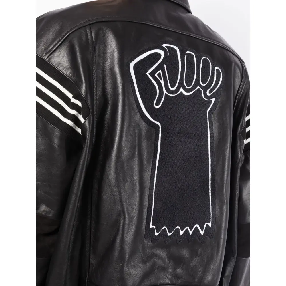Черный, кожа, нашивка, отделка в рубчик, косой воротник, застежка на молнии спереди, длинные рукава, рукава с узкими манжетами, два кармана на молнии по бокам и прямой подол.