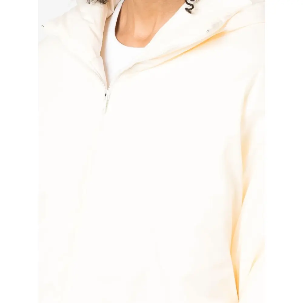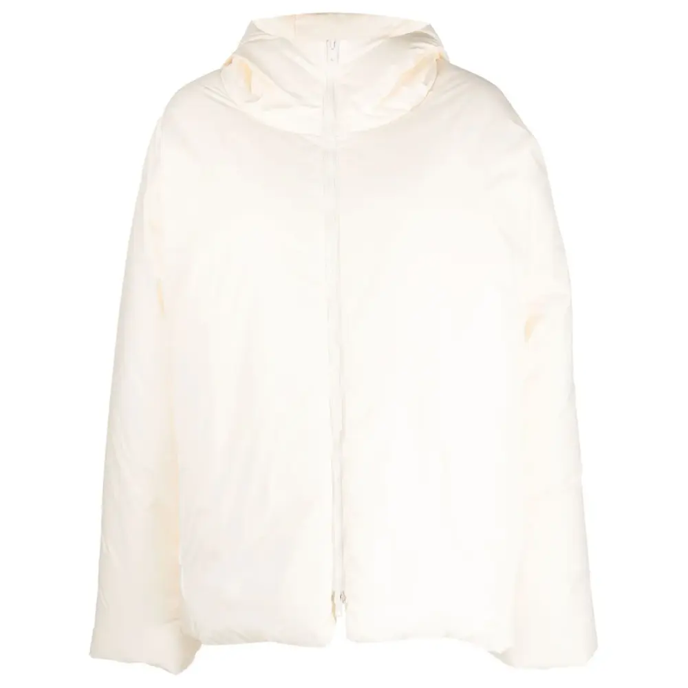 Кремово-белый, дутый материал, высокий воротник, длинные рукава и застежка на молнии спереди.