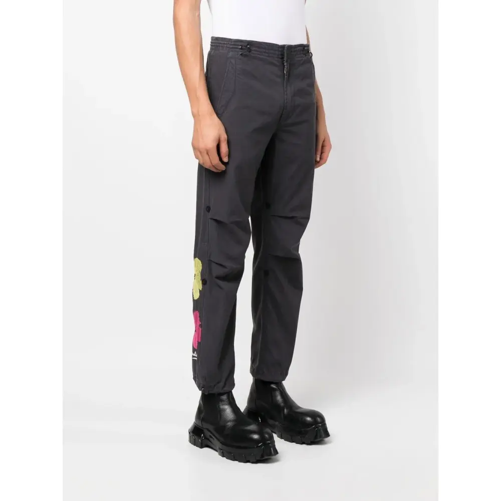 Черный, хлопок, цветочная аппликация, средняя посадка, эластичный пояс, застежка на пуговицах спереди, два вшитых кармана по бокам и узкий крой.