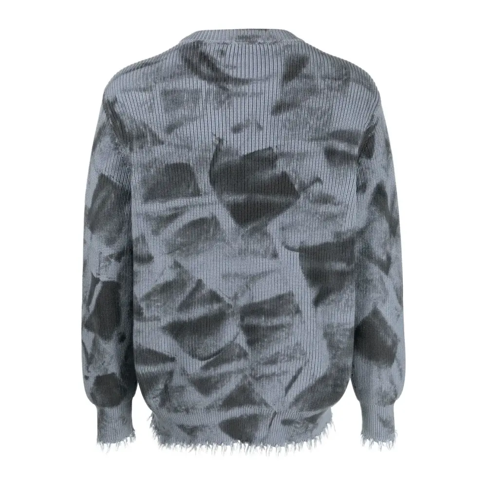 Голубой, темно-серый, трикотаж в рубчик, абстрактный принт, круглый вырез, длинные рукава и необработанные края.