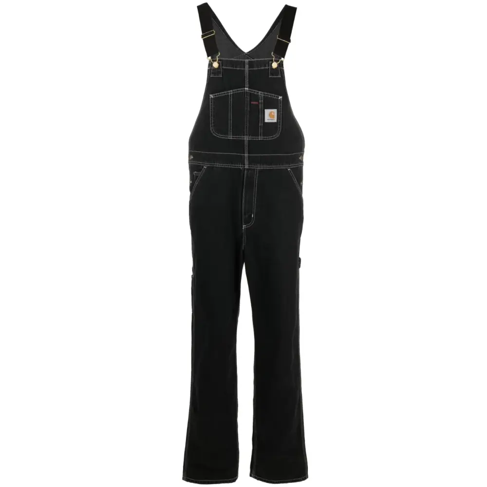Черный, хлопок, деним, нашивка с логотипом на груди, квадратный вырез, регулируемые лямки, пуговичная застежка сбоку, накладной карман спереди, два накладных кармана сзади и прямой крой.