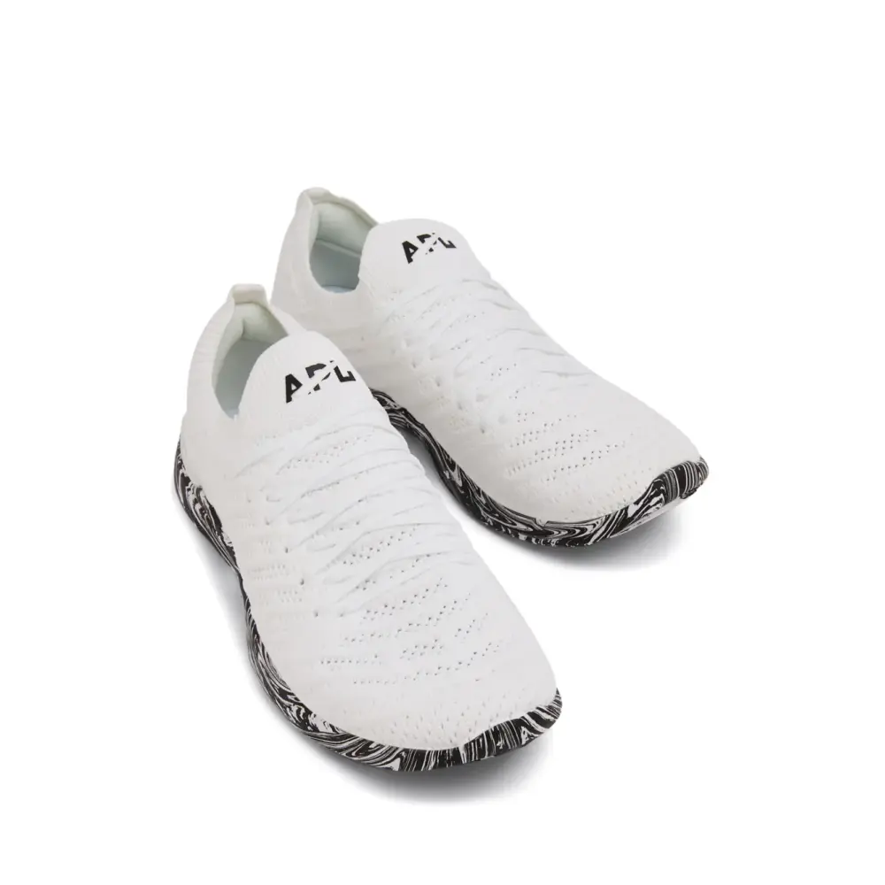 Белый, трикотажный верх, язычок с логотипом, закругленный носок, шнуровка спереди и контрастная резиновая подошва.