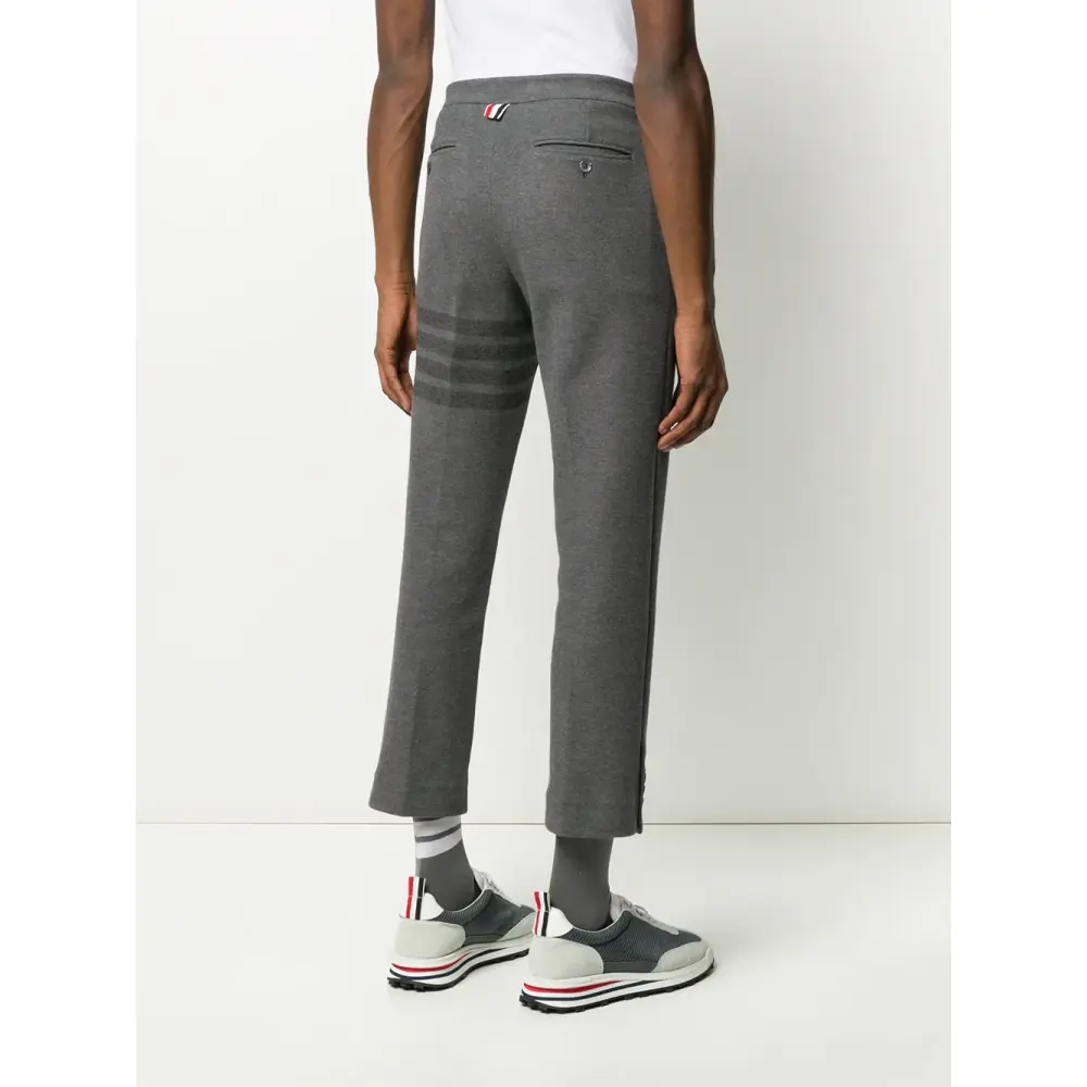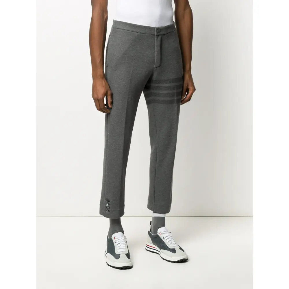Брюки кроя слим с полосками 4-Bar от THOM BROWNE. Ширинка на молнии с пуговицей, фирменная деталь с тремя полосками, два задних прорезных кармана на пуговицах, полосатый узор и обрезанная длина. Цвет: серый.