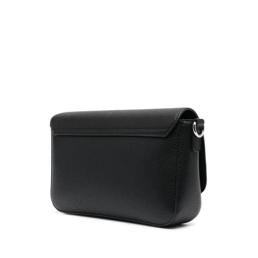 Черный, логотип спереди, зернистая текстура, откидной верх с застежкой на кнопки, ремень на плечо, внутренние отделения для карт и основное отделение.