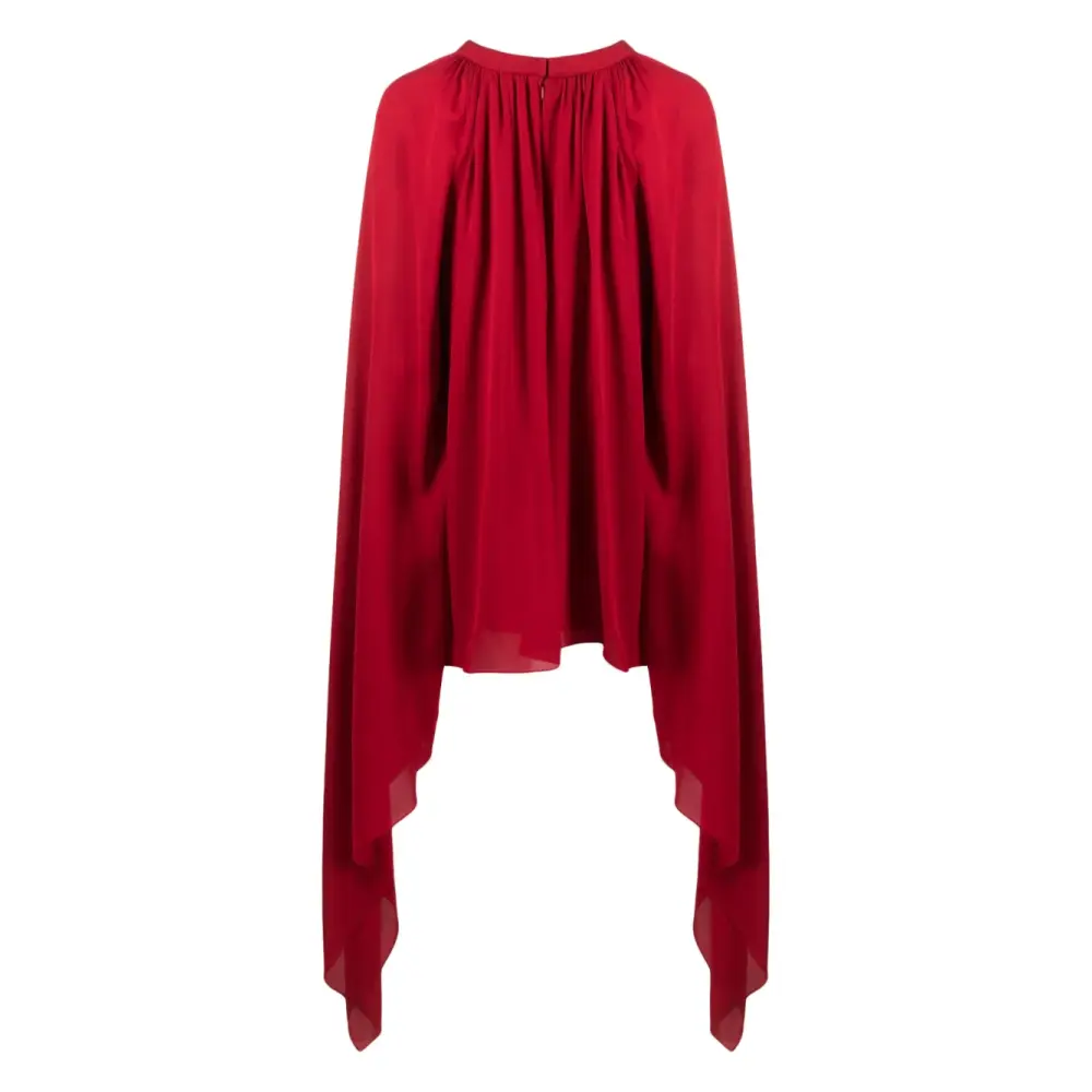 Кроваво-красный, шелк, детали с оборками, круглый вырез, длинные рукава и асимметричный подол.