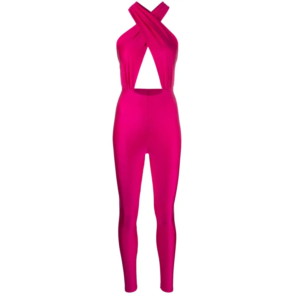 Фуксия, эластичный материал, слитная модель, модель без застежки, перекрестный вырез, перекрестные бретели на спине, открытая спина, без рукавов, эластичный пояс и узкий облегающий крой.