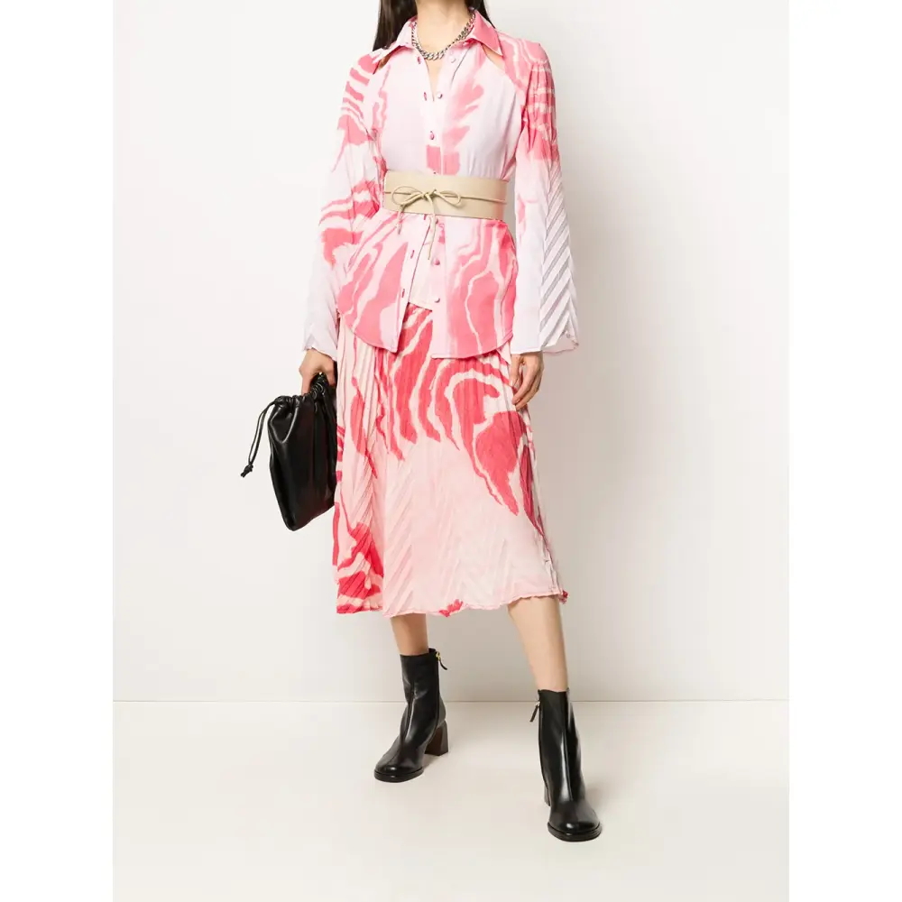 Классический воротник, застежка на пуговицах спереди, вырезные детали и закругленный подол. Цвет: розовый.
