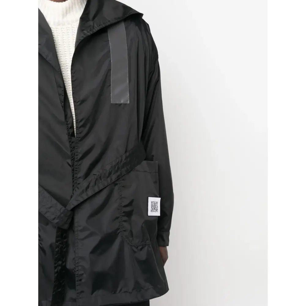Черный, водонепроницаемый материал, нашивка с логотипом спереди, классический капюшон, классические лацканы, ремень на талии, два накладных кармана спереди, длинные рукава и прямой подол.