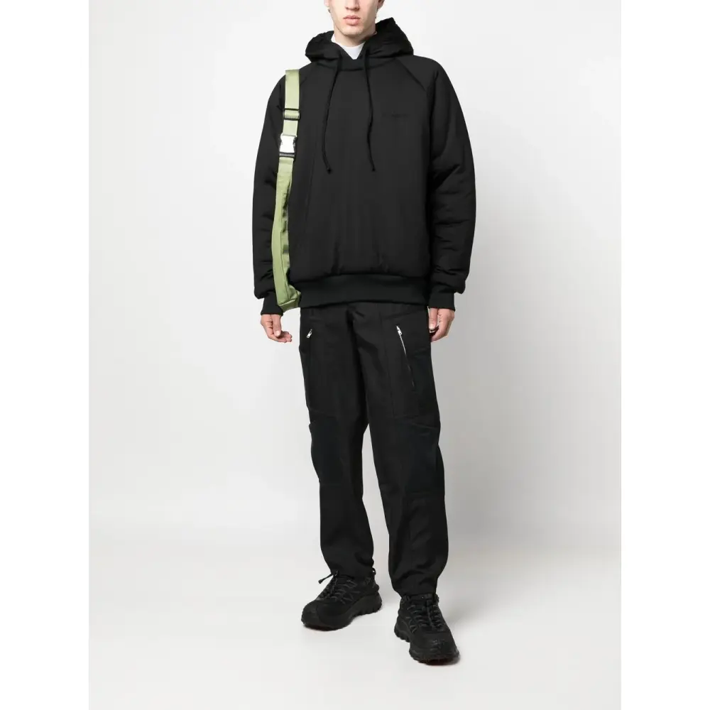Черный, дутый материал, затягивающийся на шнурок капюшон, вышитый логотип на груди, рукава реглан, манжеты в рубчик и подол в рубчик.